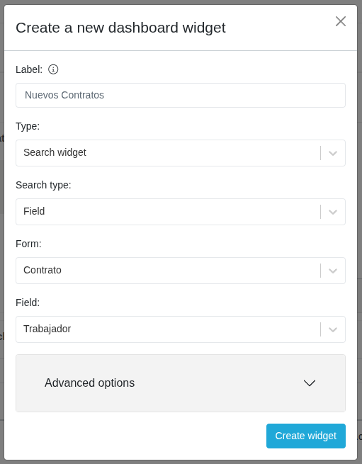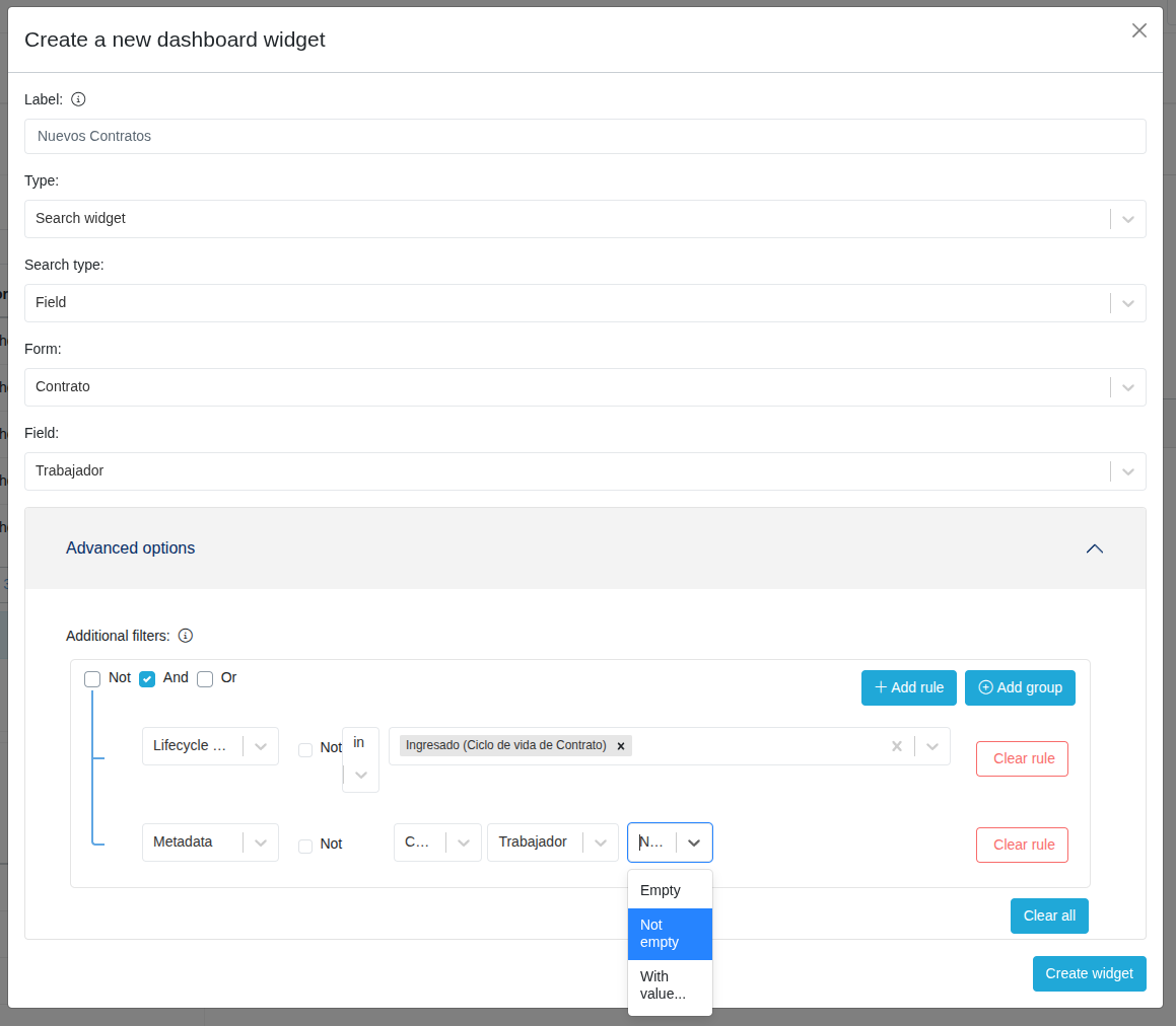 By clicking on the advanced options drop-down menu, you can include additional filters that will be applied to the documents listed in the widget: