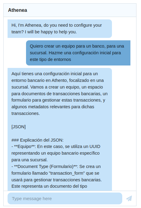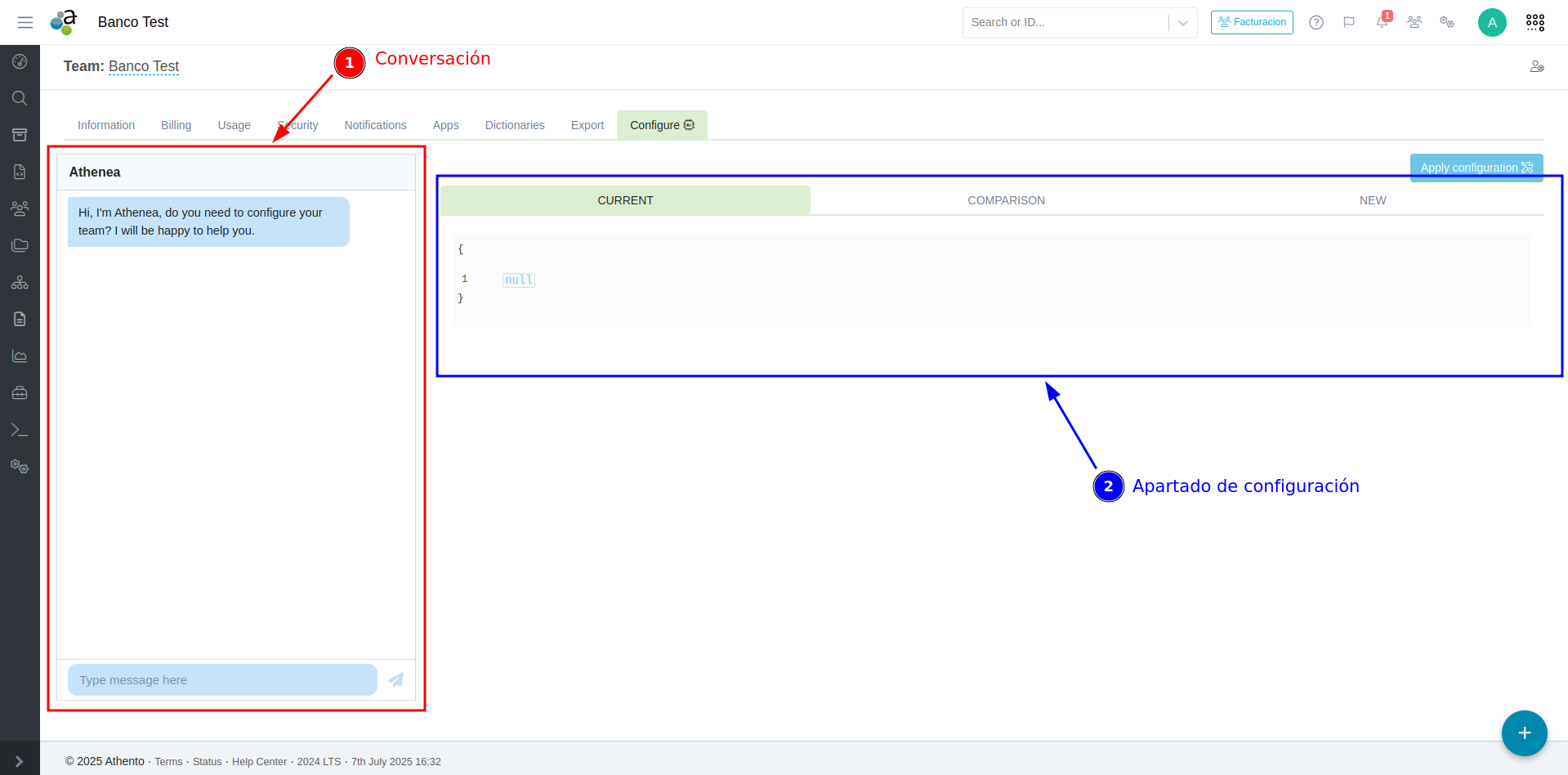 Regarding the conversation section, we will talk to Athenea and refine our configuration to achieve the desired result. Athenea will respond with a configuration JSON and an explanation of it. We can see the configuration JSON generated by Athenea in the configuration section.