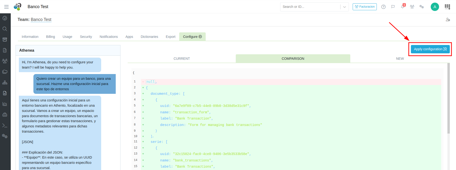 You can view the configuration generated by Athenea in the configuration section, and when you are sure of the configuration generated, click on the “Apply configuration” button.