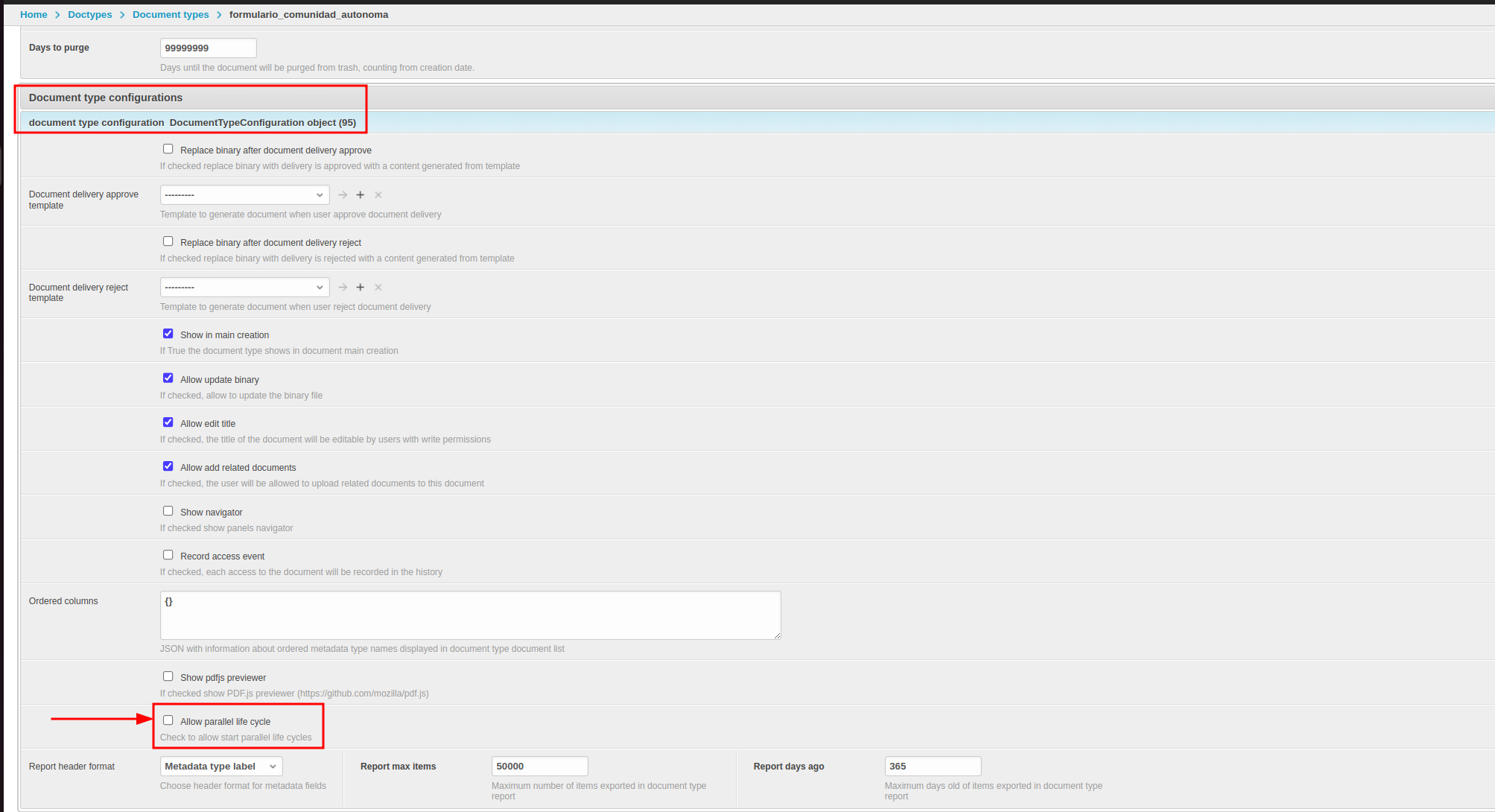 Athento allows you to disable the start of life cycles in a document. To do this, you must access the advanced settings of the document form. Once there, in the “Document type configurations” section, you must uncheck the “Allow parallel life cycle” box.