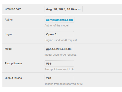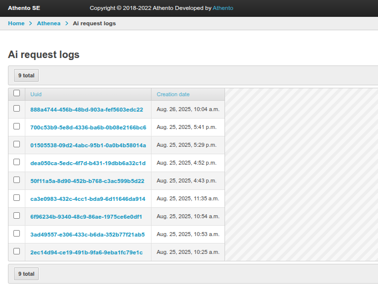 Athento records each request made to Artificial Intelligence. This can be viewed from the advanced administration section, under “AI request logs” in “Athenea.”