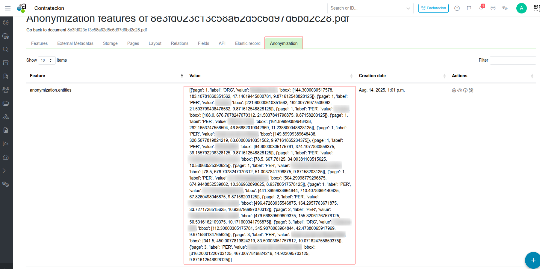 - Anonymization of the document based on the sensitive entities extracted.