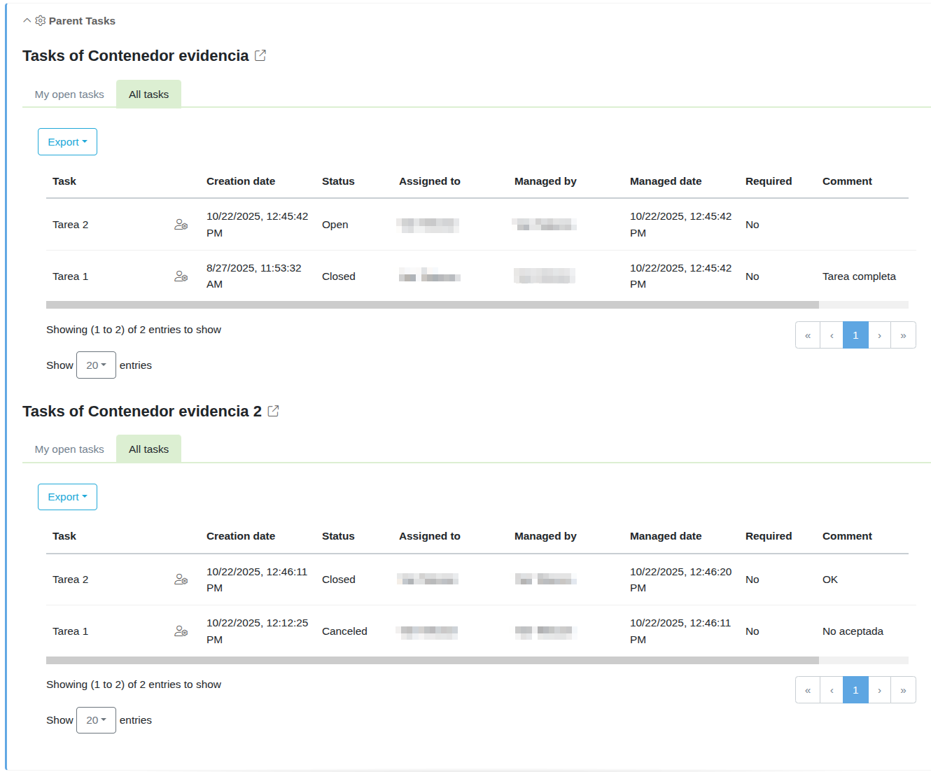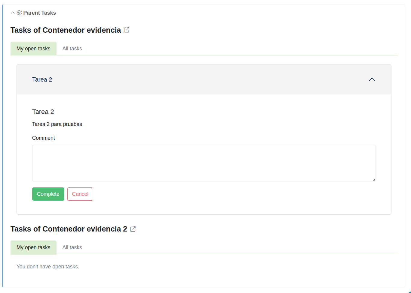 Then, if the document has parent documents, the panel is displayed in the document. Within it, the tasks for each existing parent document are shown, allowing open tasks to be completed directly from the panel: