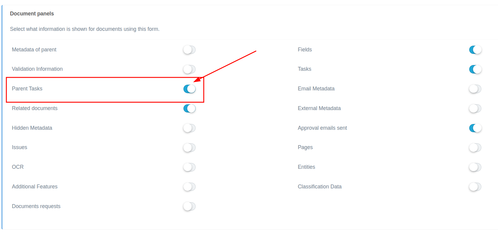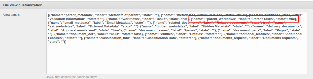 It is possible to enable the display of the Parent Tasks panel in the view of a child document. To do this, from the document type of the child document, you must enable it in the document panels section using the following button: