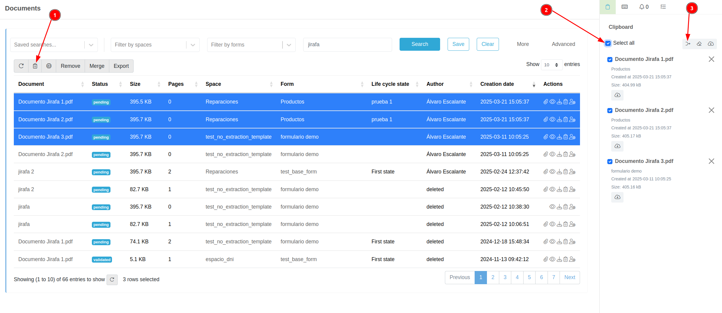 Athento permite unir o combinar documentos PDF desde el clipboard. Esto añade la posibilidad de utilizar documentos de distintas páginas y búsquedas. Para ello, lo primero que hay que hacer es acceder a la búsqueda avanzada desde la barra lateral. Una vez se haya accedido, hay que seleccionar los documentos y añadirlos al clipboard teniendo en cuenta lo siguiente: